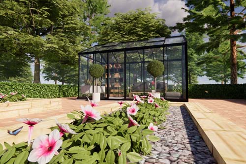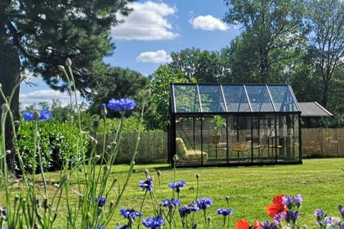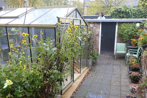 Onze loungekassen hebben verschillende goothoogtes om hiermee een andere stijl te benadrukken. Loungekas Eva is een echte compacte tuinkas en vaak waar het compact is mag men ook niet de hoogte in. Door de flauwe dakhelling blijft Loungekas Eva op een lage nokhoogte, die in veel compacte situaties mooi tot haar recht zal komen. De nokhoogte van deze loungekas is 235 cm en de goothoogte 179 cm. Doordat de deur op de kopse kant gepositioneert zit kunnen wij nog steeds een hoge instap bieden van 193 cm. Hierdoor voelt loungekas Eva nog steeds als een ruimtelijke loungeruimte waarbij u kunt genieten van het relaxen in uw kas.
